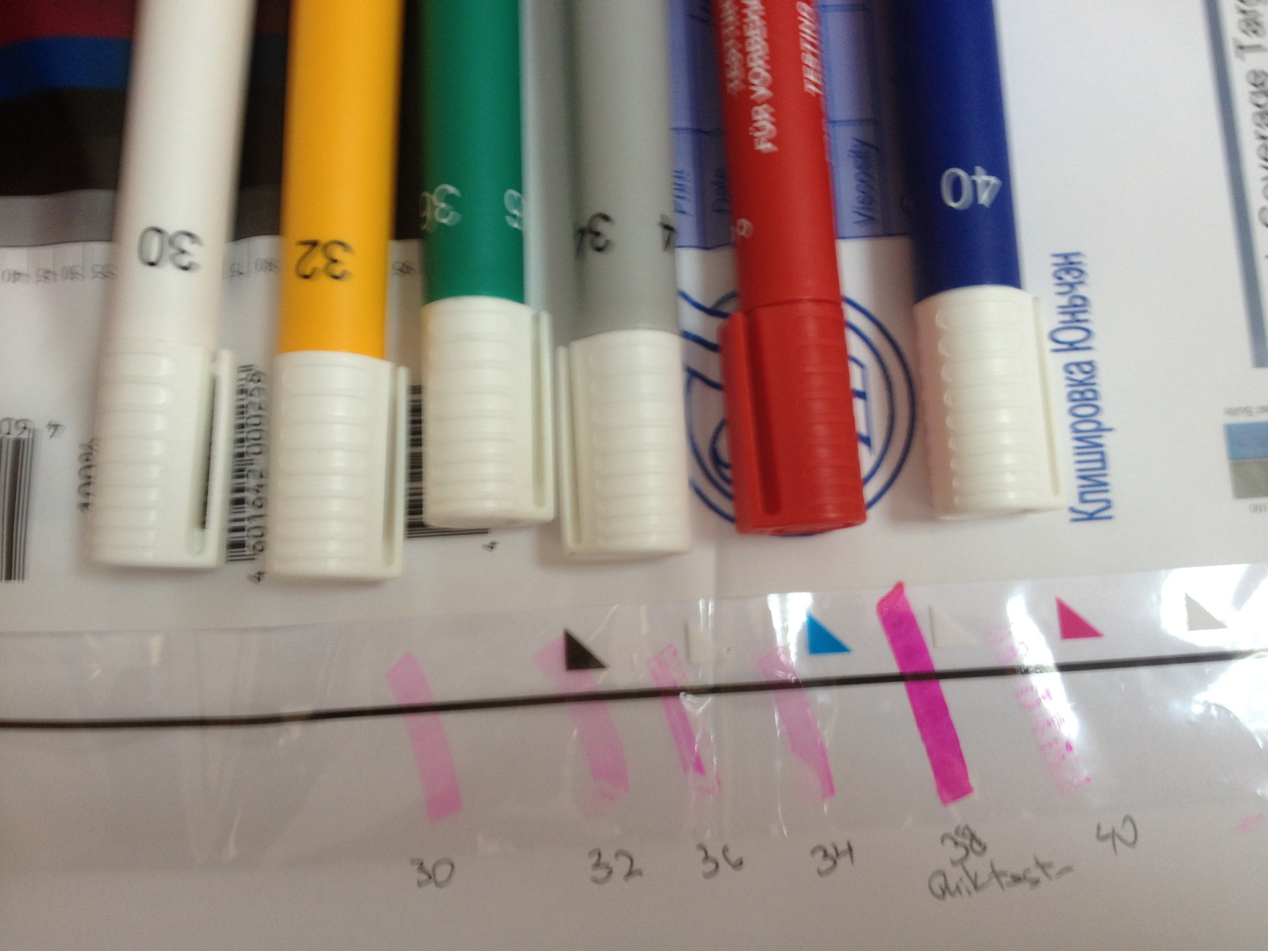 Этот метод параллельно ASTM Std. D25781, который используется при проверке полиэтилена (ПЭ) и полипропиленой (ПП) плёнки с помощью применения чернил. Жидкости, используемые в маркеров ТЕСТ™ ручек основаны на тех, которые указаны в ASTM D2578.